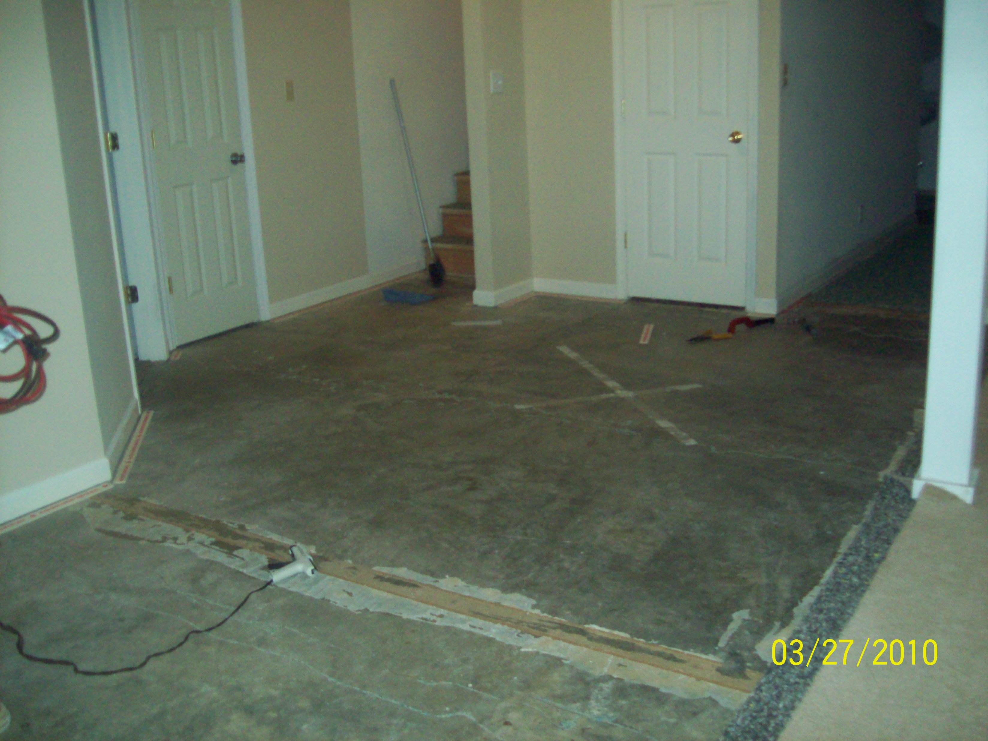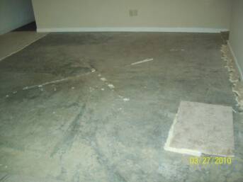 Remove old carpet and padding from room, then clean subfloor of debris.