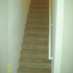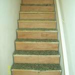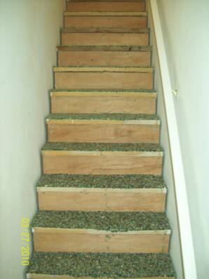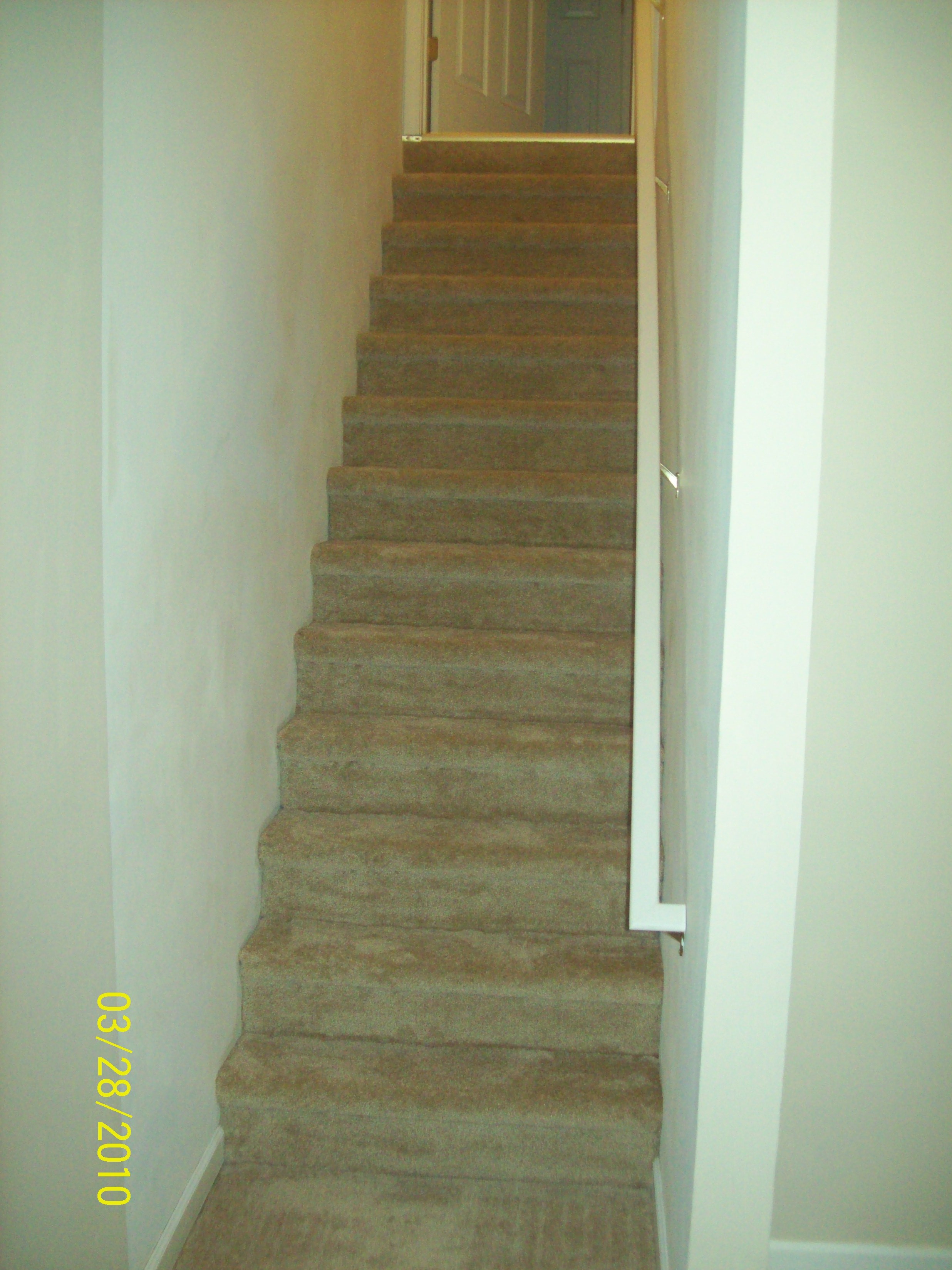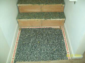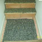 Installation of basement staircase. Clean floor of debris, install tacks strips on each stair, install padding on each step. Measure each step individually and cut a guality carpet to fit the stair. Finish staircase install.